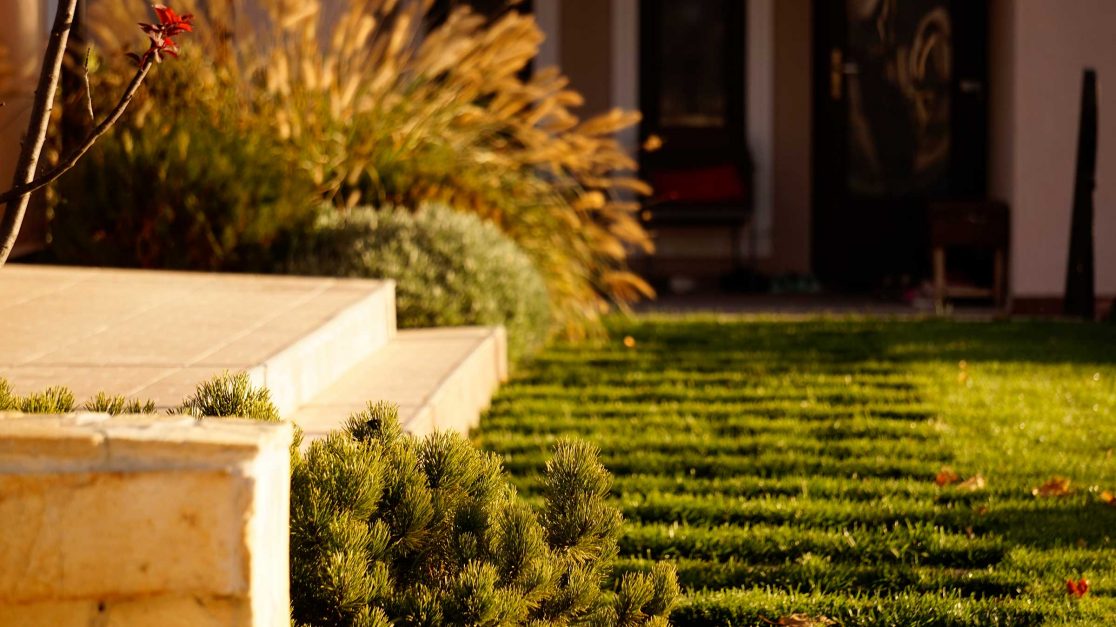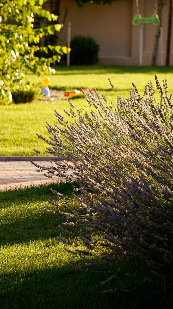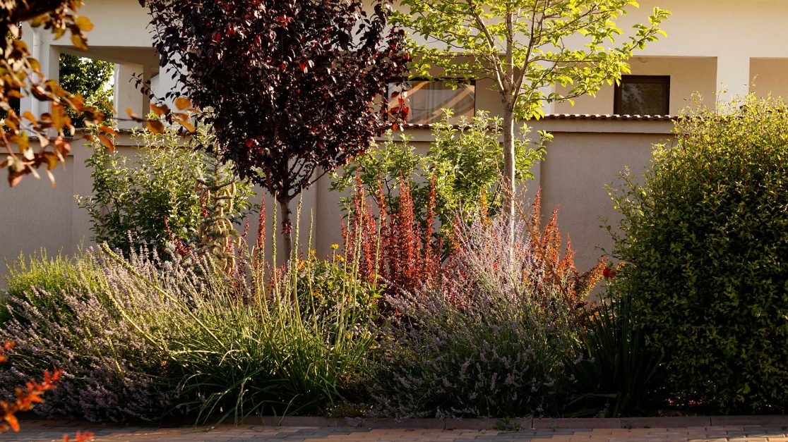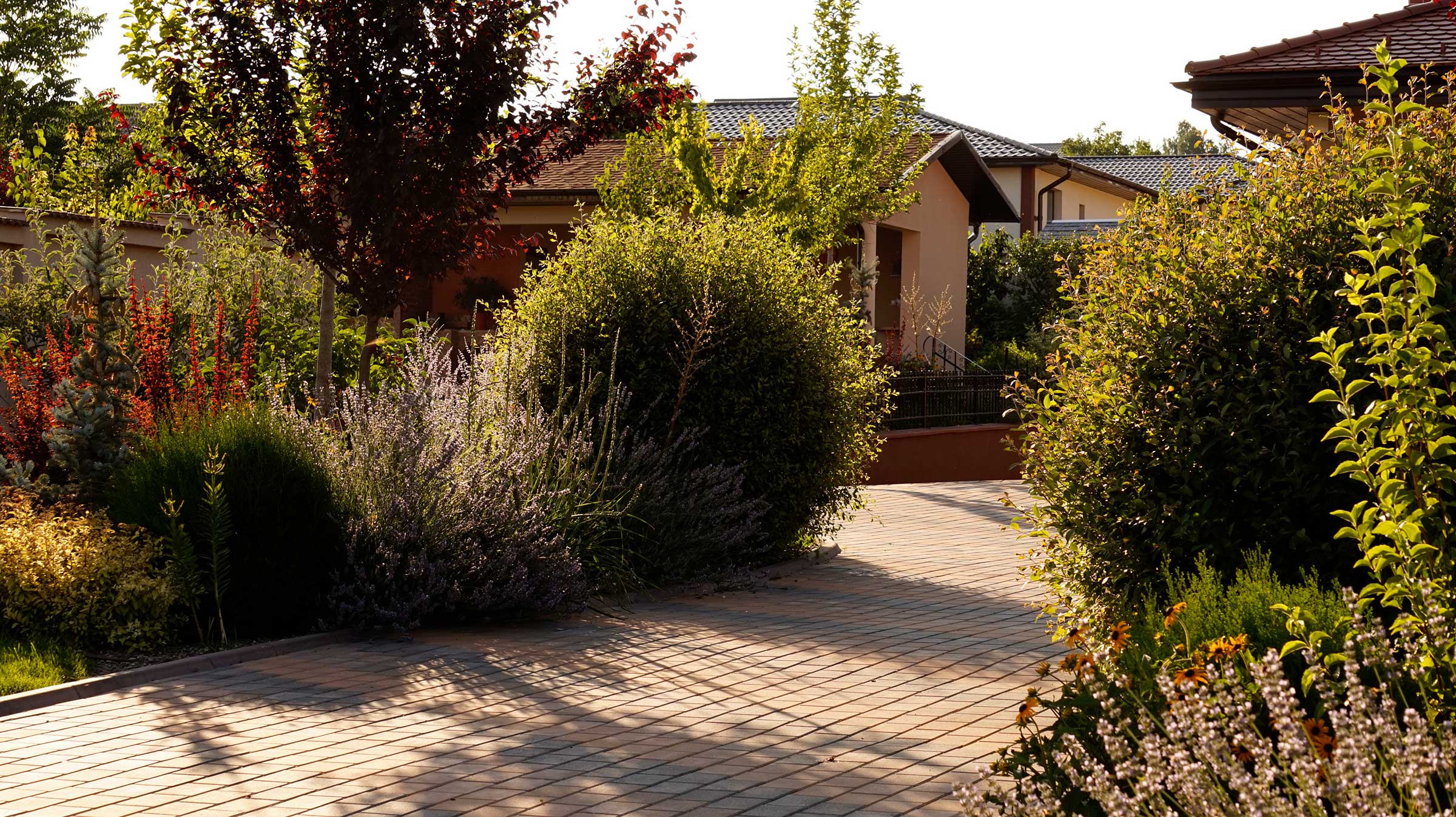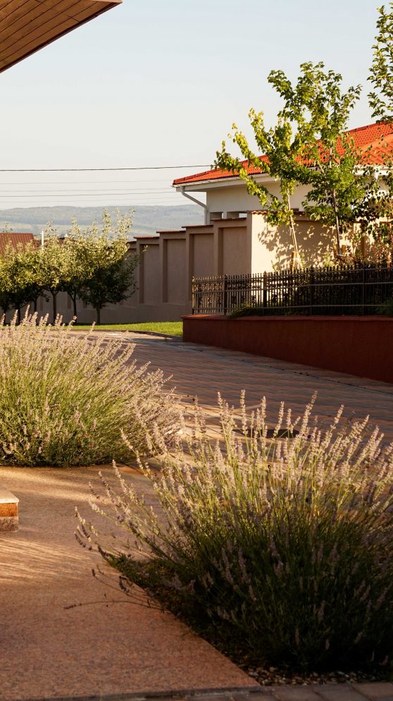 Liniile sinuoase, vegetatia abundenta, diversa si viu colorata, gazonul perfect verde realizeaza contextul perfect pentru o familie fericita.