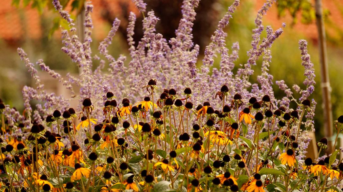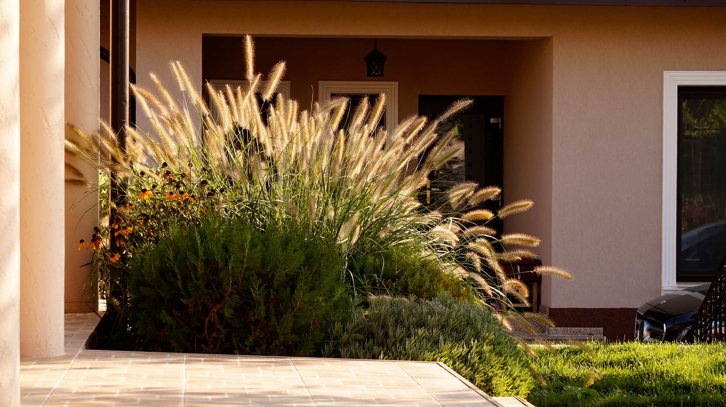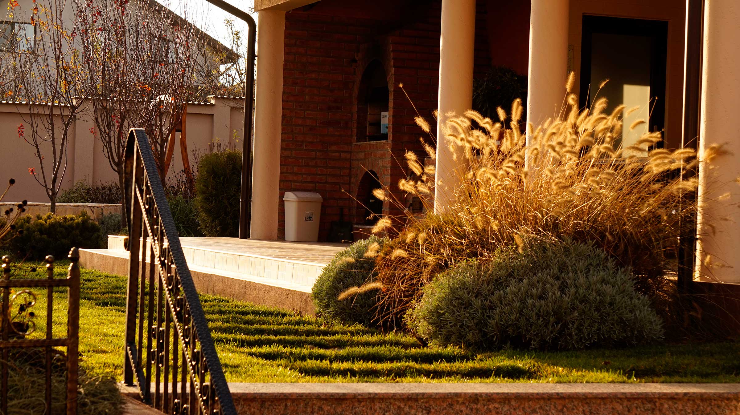 Liniile sinuoase, vegetatia abundenta, diversa si viu colorata, gazonul perfect verde realizeaza contextul perfect pentru o familie fericita.